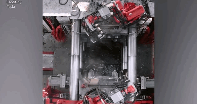 同时,由于生产零部件需要各种模具、机器臂、夹具,组装零部件也需要不同的生产线,因此零部件的大量减少,就显著降低了模具成本和组装成本。一台压铸机虽然很大,但比起传统生产线还是小了很多,占地仅100平方米。